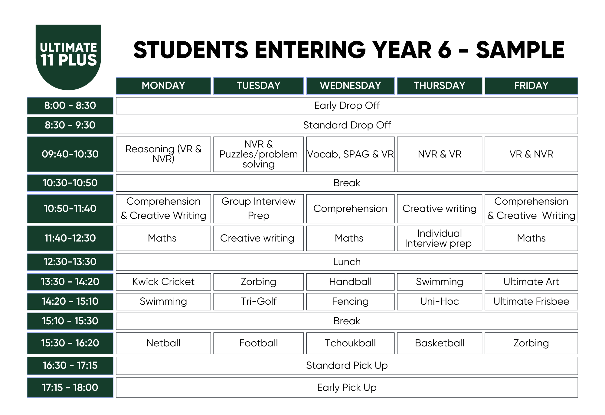 The core 11+ syllabus that is tested is taught throughout the week: Maths, English, Verbal Reasoning and Non-Verbal Reasoning. The students who are entering Year 6 will also have some interview preparation throughout the week.